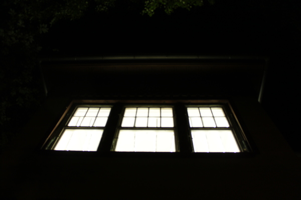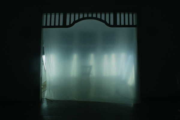 Ein einfacher Raum aus zusammengeschraubten Dachlatten, versehen mit 36 Neonröhren. Der Hocker lädt zum Verweilen ein.